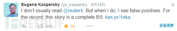 卡巴斯基本人更是第一时间在Twitter上转载路透社的文章,并评论道:这篇文章简直了。(小编意会)